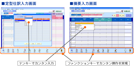 |  |  |  |  | パソコン操作が苦手な方にも、ファンクションキーやテンキーなど、わずかなキー操作で入力ができる安心設計です。 利用者の経理処理レベルに合わせて、普通仕訳入力から仕訳が分からなくても入力可能な「定型仕訳入力」、「出納帳入力」、「摘要入力」など複数の入力方式を搭載しております。