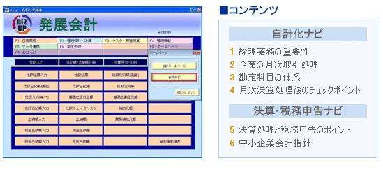 会計ナビ」は、会計システムからいつでも確認ができる経理レベル向上ツールです。経理の知識がない方にも、経理業務の基本から決算・税務申告まで、業務内容や流れがご理解いただけるようイラスト等で分かりやすく解説しています。
